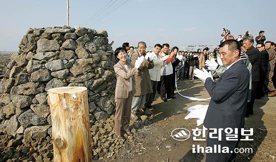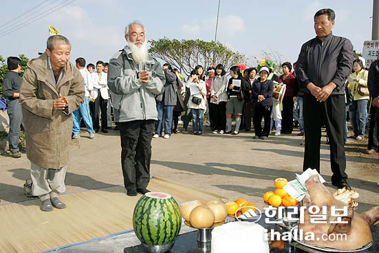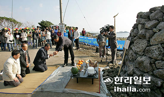 해군기지 반대 강정동 주민들과 시민단체대표들이'생명평화마을'을 선언한 가운데 10일 강정동 해안 평화염원 방사탑 앞에서 고사를 지내고 방사탑 제막식을 가졌다/사진= 강경민기자 gmkang@hallailbo.co.kr