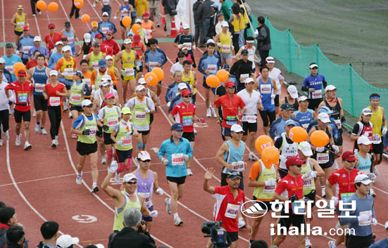 이날 오전 9시 식전행사와 9시30분 강만생 한라일보 사장의 개회선언에 이어 15분여 동안 에어로빅 및 스트레칭 등으로 간단히 몸을 푼 달림이들은 10시부터 풀코스, 하프코스, 마스터부.엘리트부(10km, 5km)으로 나눠 차례로 출발했다.