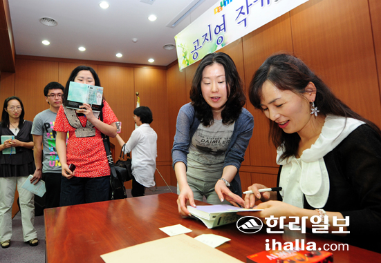 | ▲'무쏘의 뿔처럼 혼자서 가라' 등 베스트셀러의 작가 공지영씨가 26일 초청 문학 강연이 끝난 후 참석자들에게 사인을 해주고 있다. /사진=이승철기자 |
