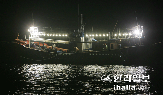 | ▲갈치채낚기 어선이 유류절약형 LED(발광 다이오드) 집어등을 환히 밝힌 채 조업하고 있다. |