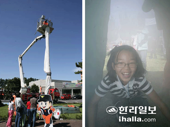 | ▲고층건물 화재시 피난탈출 체험과 화재발생시 연기 탈출 체험. |