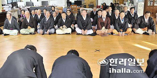 민족 고유의 명절인 설을 맞아 27일 도내 각 마을마다 새해 합동세배 행렬이 이어진 가운데 서귀포시 하효마을회관(마을회장 강경호)에서 주민들이 마을 어르신들을 모시고 세배를 올리며 덕담을 나누고 있다./사진= 강경민기자