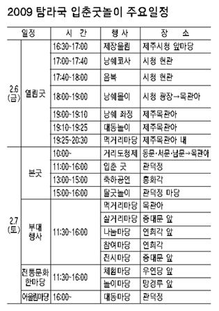 현 시대에 맞게 내용과 틀을 짜임새 있게 하면서 그 맥을 이어가고 있는 입춘굿놀이는 대동정신의 굿놀이속에 농경사회를 살았던 옛 사람들의 따스한 인정과 고운 풍습을 되새길 수 있는 시간이다. 11회째를 맞는 2009탐라국 입춘굿놀이는 입춘 이틀뒤인 2월 6일부터 7일까지 펼쳐진다.