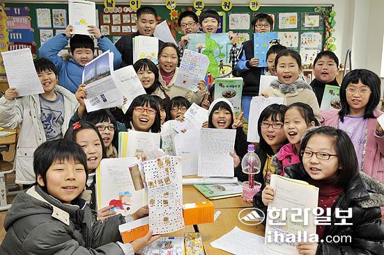 31일 개학한 제주시 일도초등학교 4학년 학생들이 밝은 얼굴로 선생님에게 제출할 겨울방학 숙제를 들어보이고 있다./사진= 강경민기자