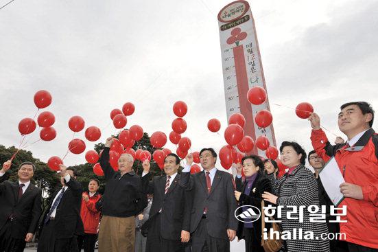 ▲제주자치도 사회복지공동모금회는 2일 신제주로터리 사랑의 열매 체감 온도탑 앞에서 '희망2009나눔캠페인' 종료와 함께 사랑의 열매 온도탑 폐막식을 가졌다. /사진=강경민기자