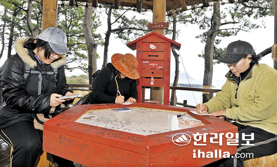 | ▲제주풍림리조트는 해안 산책로의 정자를 개조해 '바닷가 우체국'을 개설, 올레 탐방객들에게 엽서발송 서비스를 전개하고 있다. /사진=강경민기자 |