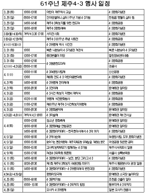 4·3도민연대는 해원방사탑제(4월 1일), 어린이 웅변대회(4월 1일), 4·3역사순례(4월 5일)를 주관한다. 한라산 관음사의 4·3원혼천도대재(3월 31~4월3일), 원불교제주교구의 제주4·3희생자를 위한 천도재(3월 29일), 기독교장로회제주노회의 4·3평화예배(3월 29일), 재일본4·3유족회의 재일본4·3희생자 위령제(4월 26일), 4·3평화재단의 4·3문화아카데미(4월 4일부터)등도 61주년 4·3의 의미를 새기는 행사다. 4·3참상의 상징적인 마을인 조천읍 북촌리의 '너븐숭이 4·3기념관'은 이달 31일 문을 연다.