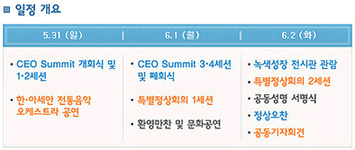 ▶CEO 정상회의=외교통상부 주관으로 특별정상회의 전날인 이달 31일부터 이틀간 개최되는 CEO 정상회의는 아세안 국가 정부 관계자와 기업인, 전문가, 국제기구 관계자 등 600여명이 참가한다. 상호 인적 네트워크를 구축하고 무역·투자 등 실질적인 협력을 증진하기 위해 개최된다. 이번 회의에서는 '변화, 도전 그리고 아시아의 번영을 위한 협력'을 주제로 '세계 경제 전망과 아시아의 역할', '무역·투자활동을 통한 공동번영 방안' 등 주요 의제에 대해 논의한다.