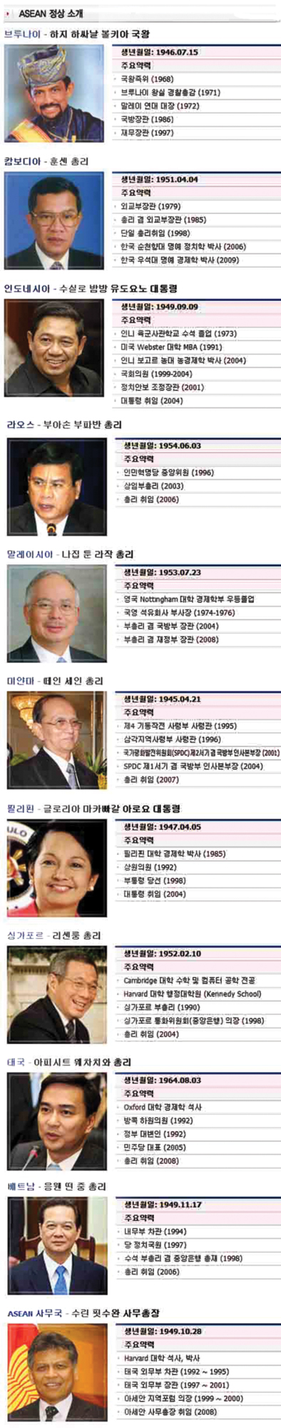 ◇아세안=브루나이와 캄보디아, 인도네시아, 라오스, 말레이시아, 미얀마, 필리핀, 싱가포르, 타이, 베트남 등 10개 동남아시아 국가들의 정치·경제적 연합체다. 2007년 현재 약 5억7000만명의 인구를 보유한 국가연합체로 전체 GDP는 1조3000억불이고, 총 교역량은 1조4000억불이다. 면적은 450만㎢로 한반도 면적의 약 20배다. 매년 정상·외교장관·경제장관·국방장관 회의 등을 개최하고, 역외국들과도 대화관계를 수립하며 협력을 다각화해 나가고 있다.