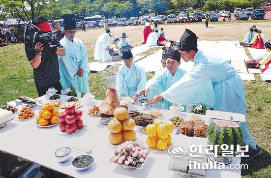 ▲제3회 전국한라산철쭉등반대회와 제43회 한라산철쭉제가 30일 윗세오름 등에서 도민과 관광객들이 참가한 가운데 열렸다. 철쭉제에서 제관들이 술을 올리고 있다. /사진=이승철기자 sclee@hallailbo.co.kr