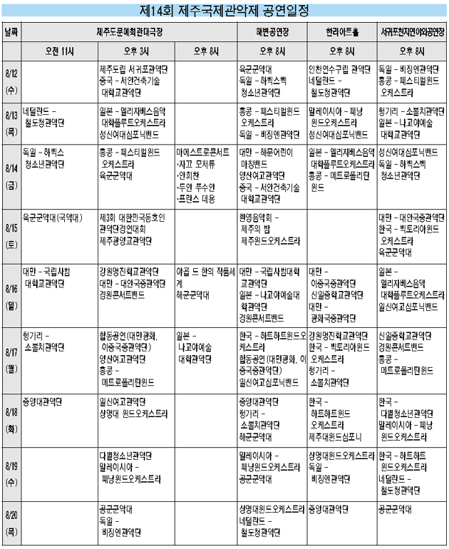 이들은 문예회관 대극장, 탑동 해변공연장, 한라아트홀, 천지연 야외공연장 등 4곳에서 연일 관악 무대가 펼치고 외돌개 올레길, 하효 쇠소깍, 한림체육관, 대흘초등교 등 이곳저곳에서 모두 80여회의 공연을 펼치며 제주를 금빛 나팔소리로 수놓는다.