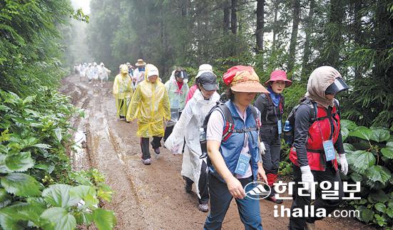 ▲가랑비가 내리는 날씨때문에 태극길 코스만 개방된 9일 거문오름 국제트레킹 대회장에는 많은 탐방객들이 찾아 제주세계자연유산의 태고적 신비를 만끽했다. /사진=강희만기자 hmkang@hallailbo.co.kr