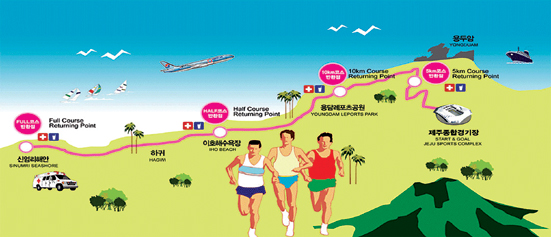 이번대회도 예년처럼 제주종합경기장 ↔ 적십자사 오거리 ↔공항로 (5km코스 반환점) ↔ 용해로 ↔ 용담해안도로 활주로 횟집(10km코스 반환점) ↔ 이호해수욕장 앞 ↔ 내도검문소 (하프코스 반환점) ↔ 신엄해안도로 (풀코스 반환점) 코스에서 진행된다.