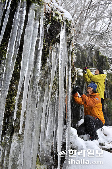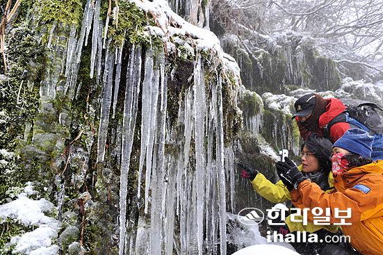 올겨울 들어 기온이 최저로 내려가는 등 본격적인 한파가 몰아닥친 16일 오전 한라산 어리목 Y계곡에는 고드름이 매달려 겨울이 빚은 아름다운 풍경을 선사하고 있다./사진= 강경민기자 gmkang@hallailbo.co.kr