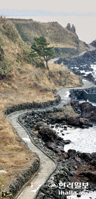 제주시 애월해안도로 끝자락에서 만날 수 있는 한담마을에서 곽지해수욕장으로 이어지는 해안 산책로는 호젓하게 걸을 수 있는 곳으로 그만이다. 산책로로 접어드는 순간 맘속마저 금세 푸르게 물들여버릴 것 같은 눈부시게 예쁜 바다빛깔에 '낭만'이란 단어가 절로 떠올려진다. 2001년 연안정비사업으로 화산석을 깔아 만들어진 1.5㎞의 해안도로는 구불구불한 길이 마치 우리네 삶을 닮아있는 듯 낯설지 않고 정겹다.