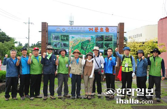 한라일보 제5기 독자위원회(위원장 김봉오) 7월 정례회의가 18일 세계자연유산 3주년을 기념해 제주시 조천읍 선흘2리에서 열리고 있는 거문오름 국제트레킹 현장에서 열렸다.