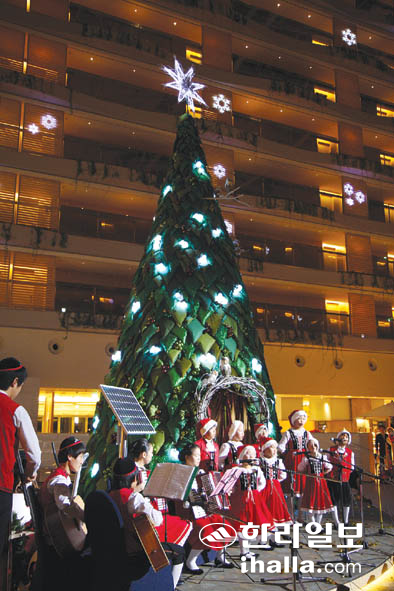 제주해비치호텔에 설치된 12m 성탄 트리는 태양광 전지와 자전거 발전기를 이용하여 등을 밝히는 방식으로 청정 에너지를 이용한 저탄소 녹색 성장을 실천해 눈길을 끈다. 기존의 장식 형태와는 달리 재활용된 섬유 조각에 색과 장식을 입혀 대형 철골에 부착하는 방식으로 불필요한 일회성 장식을 최소화하여 매년 재사용할 수 있도록 꾸몄다. 또한 자연 채광이 되는 아트리움 로비의 특성을 이용 트리 옆에 설치된 태양광 전지판에 집적된 전원을 장식 전구에 연결하여 화석 에너지 소비를 최소화했다.