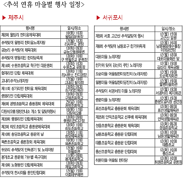 ▶민속자연사박물관=12~13일 오전 10시부터 오후 5시까지 박물관 광장에서 '제주 전통 먹거리 체험장', '제주 전통놀이 체험장', '추석 어린이 놀이마당', '추석 전래놀이마당', '민속놀이 경연대회'가 펼쳐진다. 이 기간 박물관은 정기휴관으로 전시실은 개방하지 않는다. 행사 프로그램으로는 투호놀이, 딱지치기, 고무줄놀이, 윷놀이, 제기차기, 팽이치기, 굴렁쇠 굴리기 등이 마련되고 어린이들의 흥미를 돋울 수 있도록 페이스페인팅, 요술풍선 만들기, 버블놀이, 만화 캐리컬쳐 등도 함께 진행된다. 또한 제주 전통 먹거리 체험장에서는 오메기주와 오메기떡을 무료로 맛볼 수 있으며, 제주 전통 음식인 빙떡도 직접 만들어볼 수 있다.