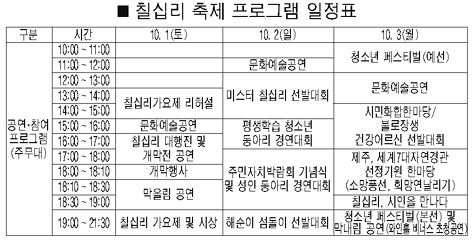 거리 퍼레이드 칠십리 대행진과 개막공연을 시작으로 칠십리 길거리 농구대회, 미스터 칠십리 선발대회, 청소년 동아리 경연대회, 성인 동아리 경연대회, 해순이 섬돌이 선발대회, 칠십리가요제, 칠십리 칠십선 사진 콘테스트, 불로장생 건강노인 선발대회, 시민화합한마당, 숲속 책방 및 시낭송, 지역 명품 브랜드관, 웰빙장터 등 다양한 프로그램이 마련돼 있다. 불로장생 트레킹존과 힐링존, 뷰티존 등이 새롭게 들어선다.
