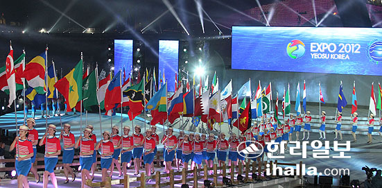 | 11일 오후 전남 여수시 여수세계박람회장 빅오무대에서 열린 2012여수세계박람회의 개막식에서 참가국 기수단이 퇴장하고 있다. |