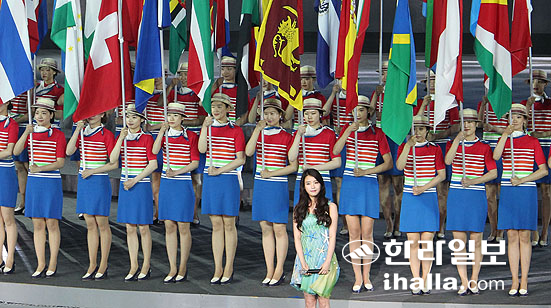 | 11일 오후 전남 여수시 여수세계박람회장 빅오무대에서 열린 2012여수세계박람회의 개막식 개막공연에서 가수 아이유가 엑스포 공식 로고송 '바다를 기억하는 이야기'를 부르고 있다. |