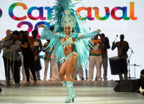 4일(현지시간) 브라질 리우데 자네이루에서 열린 2013 삼바 콘테스트에서 2013 리오의 카니발 여왕 후보 신시아가 경연을 펼쳐보이고 있다./연합