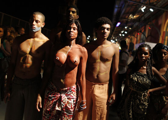 7일 브라질 리오데자네이로에서 열리고 있는 패션 리오쇼에서 흑인모델의 참여확대를 촉구하는 시위가 열리고 있다./연합