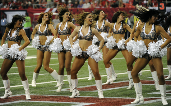 18일(현지시간) 미국 애틀란타 조지아돔에서 애틀랜타 팔콘의 치어 리더들이 애리조나 카디널스와의 NFL 경기에서 하프타임때 역동적인 율동을 선보이고 있다./연합