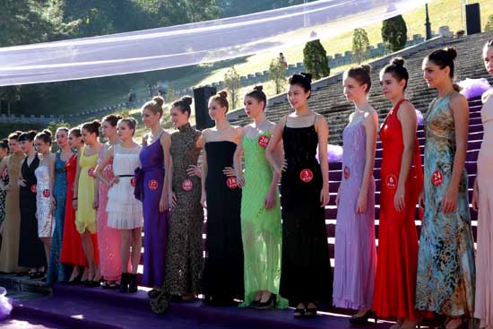 22일 중국 운남성 메이지후 가든에서 열린 뉴실크로드 미스월드 대회에서 참가자들이 단체사진을 촬영하고 있다./연합