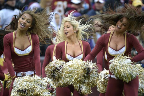 12월 9일(현지시간) 미국 매릴랜드 페덱스 필드에서 펼쳐진 워싱턴 레드스킨과 볼티모어 레이븐스와의 경기에서 워싱턴 레드스킨의 치어리더들이 열정적인 응원전을 전개하고 있다./연합