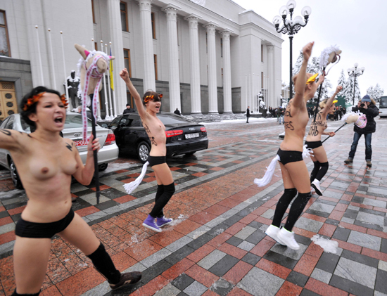 12일(현지시간) 키예프의 우크라이나 의회앞에서 가슴을 드러내고 누드시위하는 것으로 유명한 우크라이나 여성단체 피멘의 회원들이 새로 선출된 의회 (Kiev)에서 새로 선출 된 의회를 지지할 수 없다는 항의시위를 벌이고 있다./연합
