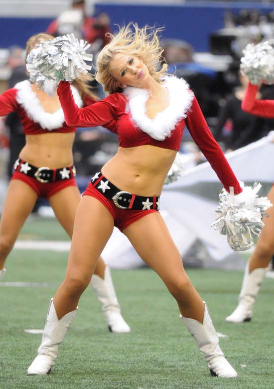 23일(현지시간) 미국 텍사스의 카우보이 스타디움에서 열린 NFL 댈라스 카우보이와 뉴올리언스의 경기에서 카우보이 치어 리더들이 매년 크리스마스 하프타임에 맞춰 열정적인 춤사위를 선보이고 있다./연합