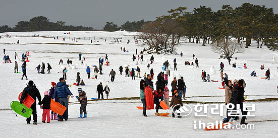 천연 눈썰매장으로 변한 마방목지 나들이 인파모습