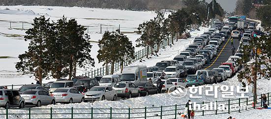 계사년 첫 날인 1일 오후 제주시 마방목지 인근 5.16도로가 나들이객 차량들로 혼잡을 이루고 있다./사진= 강경민기자