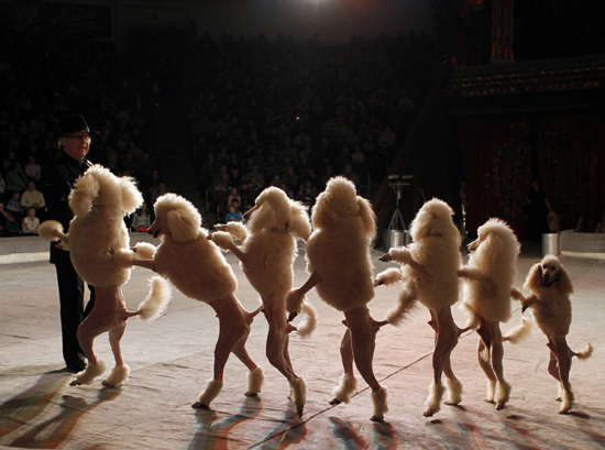 24일(현지시간) 우크라이나 수도 키예프에서 열린 국립서커스에서 푸들 강아지와 조련사가 '마음에서 마음으로'라는 주제의 새로운 프로그램을 선보이고 있다./연합