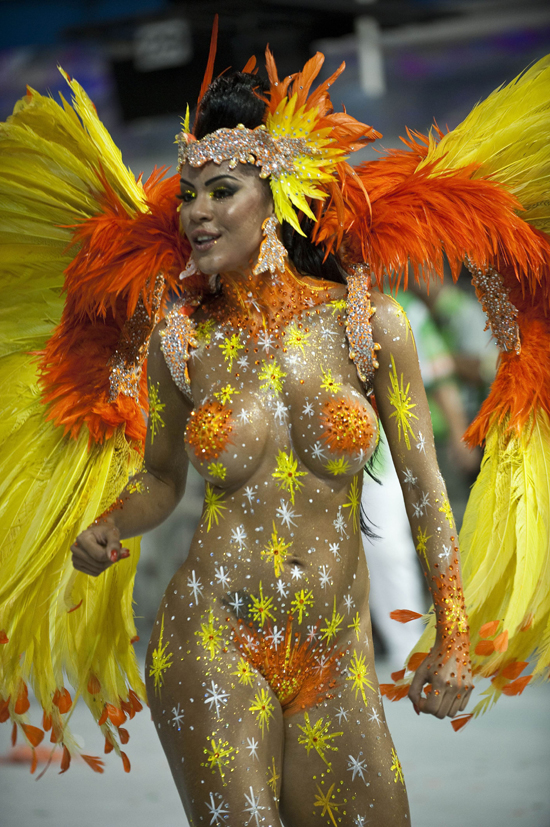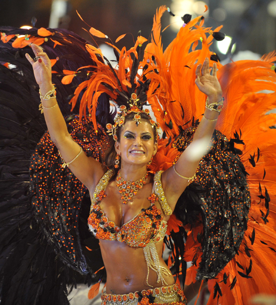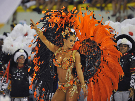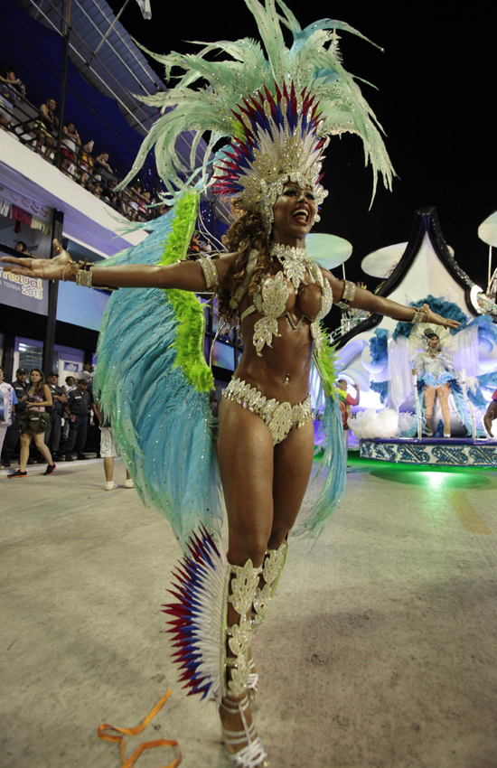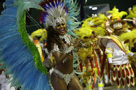 10일(현지시간) 브라질 리우데자네이루에서 열리고 있는 삼바 퍼레이드에서 참가자들이 화려한 자태를 뽐내고 있다./연합