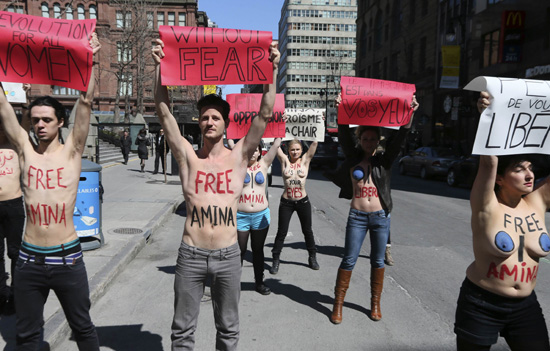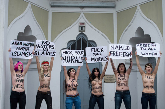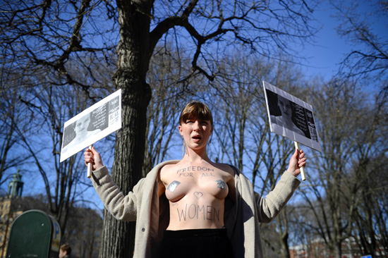 | 여성운동단체 '페멘'(Femen) 소속 활동가들이 4일(현지시간) 베를린과 파리, 브뤼셀, 키예프에서 이슬람 국가의 여성 인권 탄압에 항의한다며 상의를 탈의한 채 반라 시위를 벌였다. 베를린과 키예프, 브뤼셀에서 시위에 나선 이들은 각 도시의 이슬람 사원 앞을 시위 장소로 택했고 파리의 활동가들은 튀니지 대사관 앞에서 시위에 나섰다. 이들은 튀니지의 여성운동가 아미나 타일러가 웃옷을 모두 벗은 모습의 사진을 인터넷에 게재한 일로 인해 형사 기소될 위기에 처한 데 항의하며 '내 몸은 나의 것이고 내 권리'라는 등의 구호를 외쳤다. 페멘은 20대 금발 여대생 등으로 구성된 우크라이나 여성단체로 지난 2010년부터 민주주의 향상과 반부패 척결 등을 앞세워 반라 시위에 나서면서 유명해졌다./연합 |