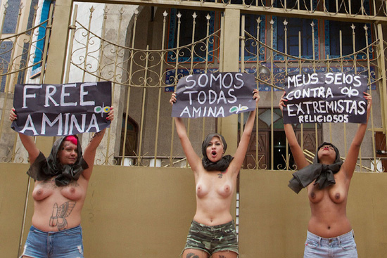 4월4일(현지시간) 브라질 상파울로의 이슬람 사원앞에서 급진적인 여성 인권운동 단체 '페멘(Femen)' 회원들이 시위를 벌이고 있다./연합