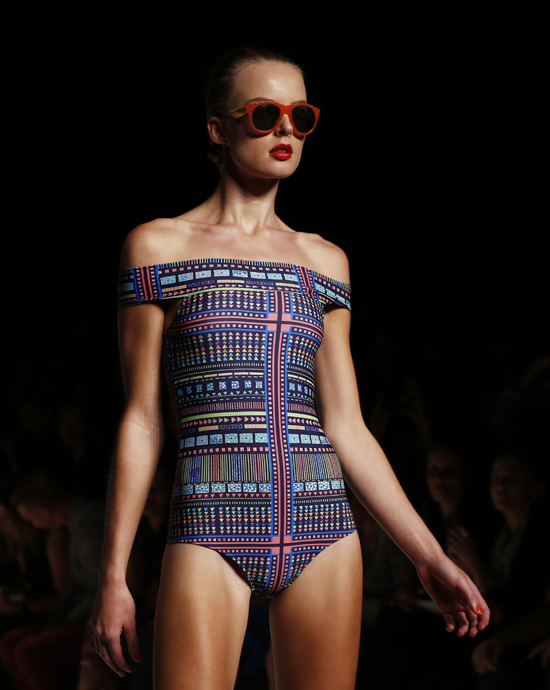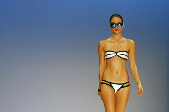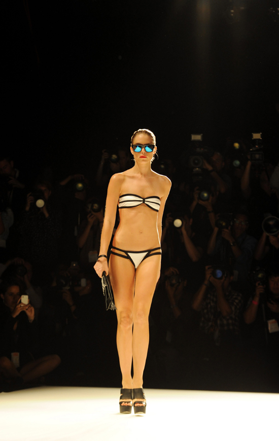 4월8일(현지시간) 호주 시드니에서 열린 메르세데스벤츠 패션위크에서 한 모델이 비키니 수영복을 선보이고 있다./연합