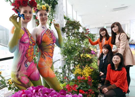 롯데백화점이 11일 오전 서울 중구 소공동 본점 에비뉴엘-영플라자 사이 다리 '러브릿지'에서 '나비 페스티벌'을 진행하고 있다./연합