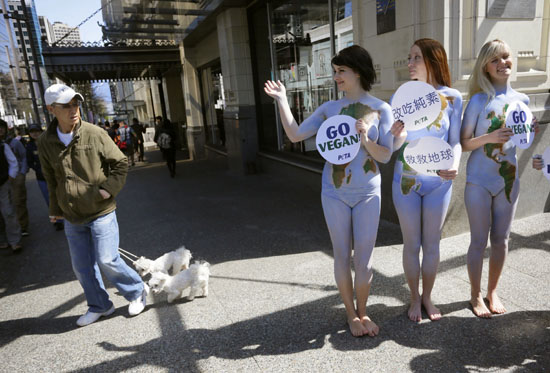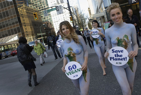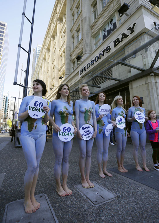 22일 캐나다 밴쿠버 시내에서 지구의 날을 맞아 녹색과 파란색으로 바디페인팅한 동물보호단체 회원들이 누드시위를 벌이고 있다./연합