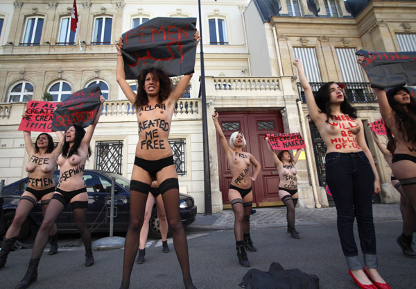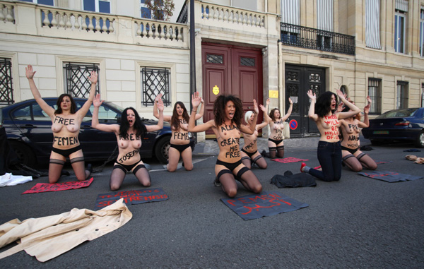 이집트 여성운동가와 여성 단체 피멘(FEMEN) 회원들이 5일(현지시간) 프랑스 파리의 튀니지 대사관 앞에서 토플리스 차림으로 시위하고 있다. 이들은 튀니지에서 재판을 받고 있는 피멘 회원들의 석방을 요구하고 있는데, 현재 3명의 유럽 여성들이 토플리스로 반이슬람 시위를 벌이다 체포돼 수감 중에 있다.연합