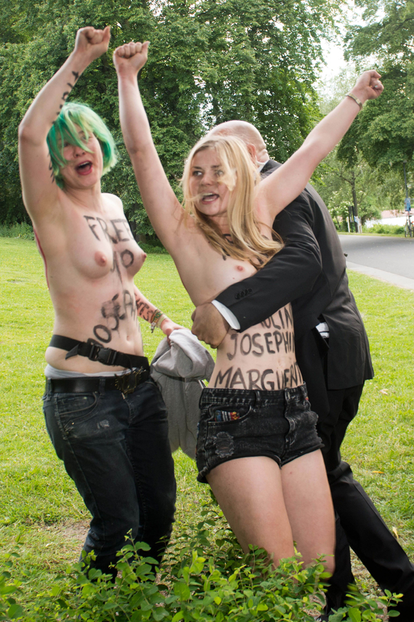 여성 인권단체 ‘피멘(Femen)’ 회원들이 13일(현지 시간) 베를린에서 튀니지 여성 운동가들의 체포에 항의하는 시위를 하고 있다./연합