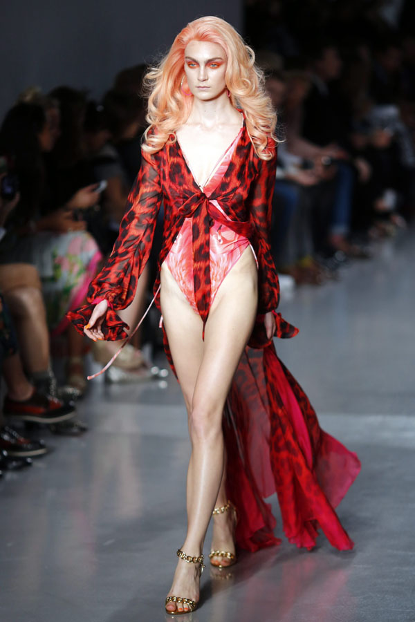 한 모델이 17일(현지시간) 영국 런던에서 열린 런던 패션위크 행사에서 케이티 이어리의 2014 S/S 컬렉션을 선보이고 있다./연합