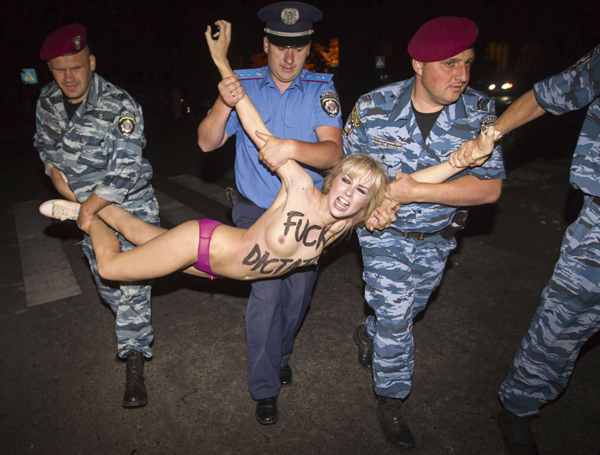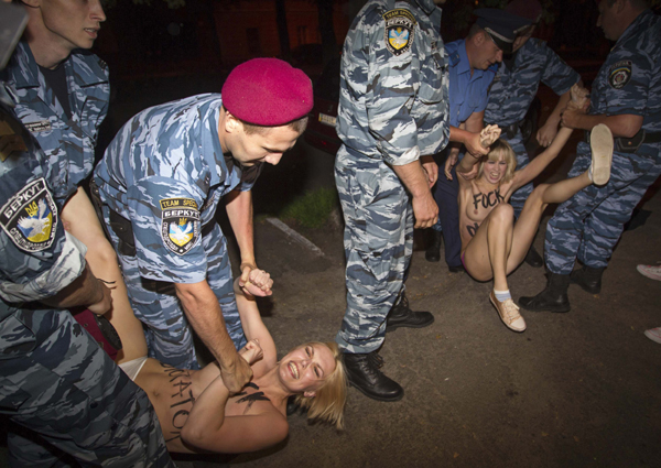 18일(현지시간)'피멘(Femen)' 회원들이 우크라이나 키예프의 한 건물 앞에서 누드 시위를 하다 체포되고 있다. 여성 권리 단체 '피멘'은 이날 알렉산드르 루카센코 벨라루스 대통령이 머무는 건물 앞에 모여 루카센코의 독재 정치를 비판하는 시위를 벌였다./연합