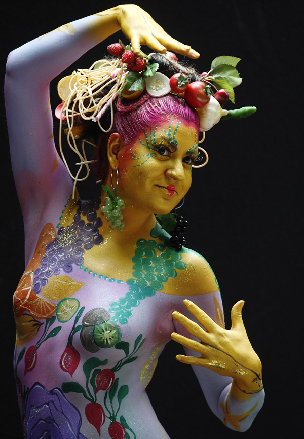 한 모델이 5일(현지시간) 오스트리아 푀르트샤흐에서 열린 세계 보디페인팅 페스티벌에서 포즈를 취하고 있다.연합