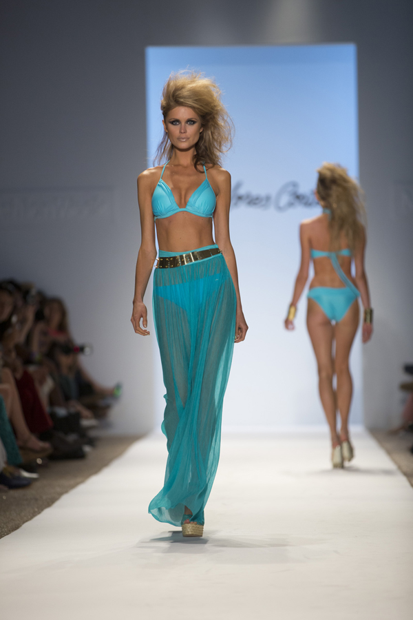7월19일(현지시간) 미국 플로리다 마이애미 비치에서 열린 메르세데스 벤츠 패션위크에서 모델들이 수영복을 선보이고 있다./연합