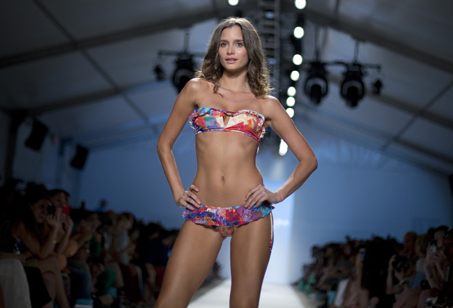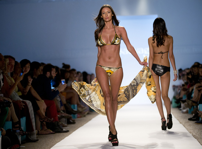7월 22일(현지시간) 미국 플로리다주 마이애미 비치의 메르세데스-벤츠 패션위크 행사에서 모델들이 수영복 패션을 선보이고 있다.연합