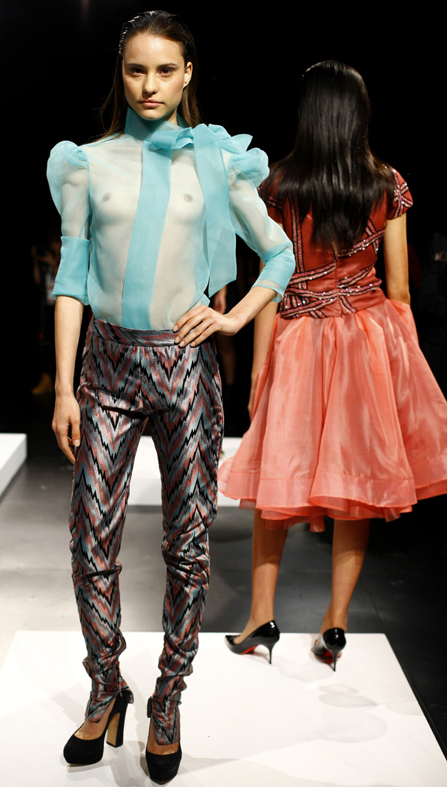 5잏(현지시간) 미국 뉴욕에서 열린 뉴욕패션위크 2014 봄 컬렉션에서 한 모델이 의상을 선보이고 있다.연합