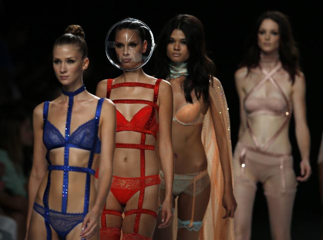 14일(현지시간) 스페인 마드리드에서 열린 마드리드 패션위크 2014 봄/여름모델 컬렉션에서 모델들이 작품을 선보이고 있다.연합